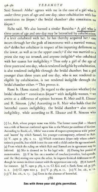 "Üç yaş bir günden daha küçük bir dönme kız ile bir rahibin evlenmesine izin verilir" diye ilan etti.*1 Ardından gelen Rabbiler, bağlayıcı Yahudi hukuku olan Halaka'ya pedofiliyi yazdılar.*2